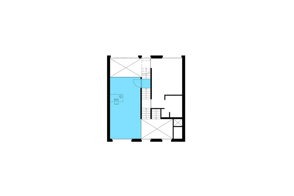 De tweedeling is in de woning ingezet om een interieur vol beleving te realiseren. De tussenstrook aan de buitenkant van de woning correspondeert aan de binnenzijde met een over de hele hoogte van het huis doorlopende ruimte waarin trappen de verspringende vloeren van de beide woonhuishelften ontsluiten. In de ene helft van het huis is aan de voorzijde ter plaatse van de entree een anderhalve verdieping hoge entreeruimte gerealiseerd. Dat is riant binnenkomen! In de andere helft is aan de achtergevel een vide over de hele hoogte van het huis gerealiseerd.