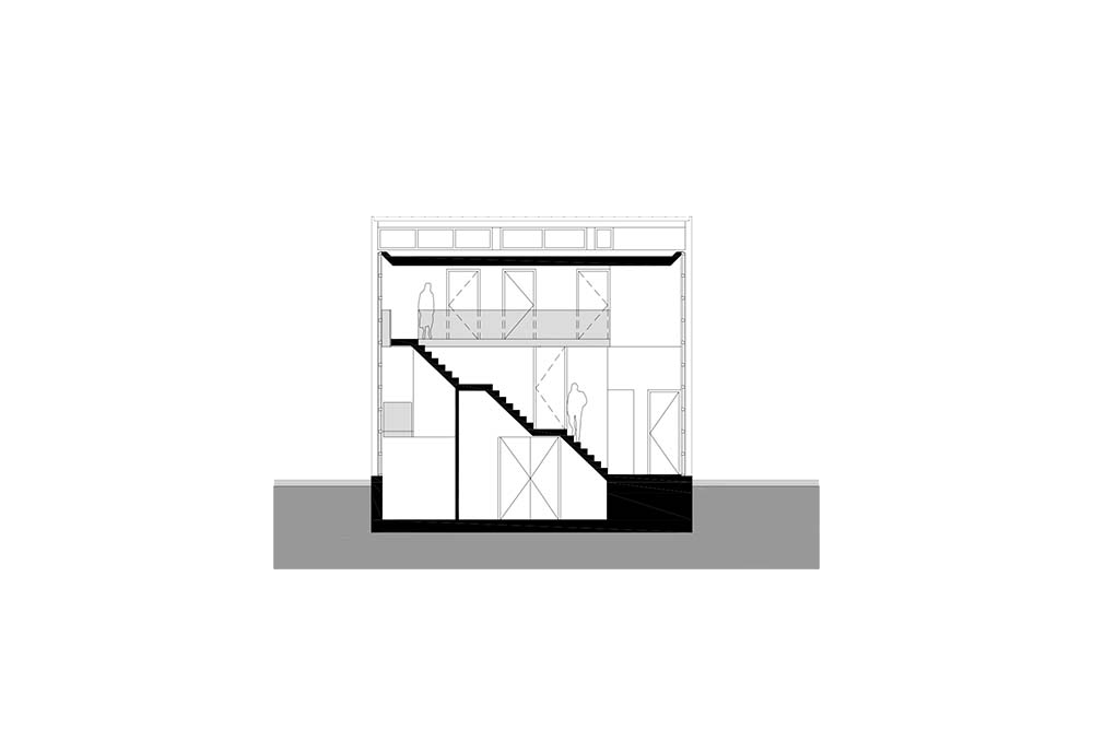 De straat wordt gekarakteriseerd door kleine, smalle, vrijstaande woonhuizen met een diversiteit aan dakvormen en tussenruimtes van ongeveer één meter. Om het huis qua maat, schaal en ritme te voegen in het historische straatbeeld is het opgedeeld in twee helften met in hoogte verspringende schuine daken en een transparante tussenzone van een meter.