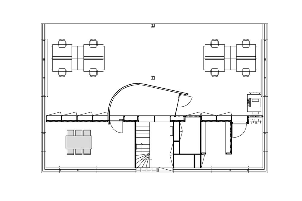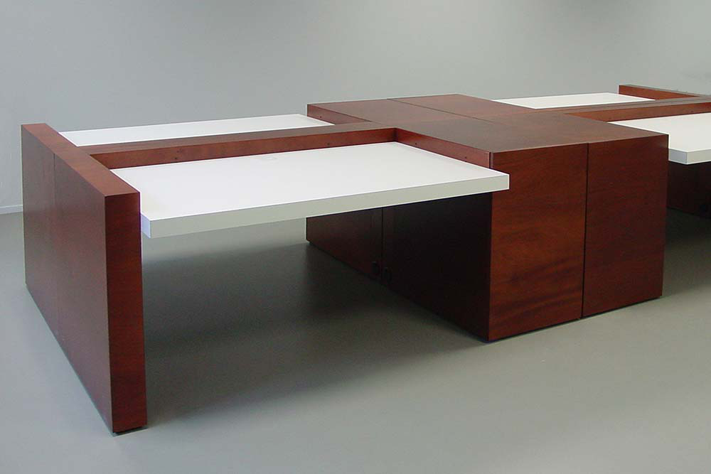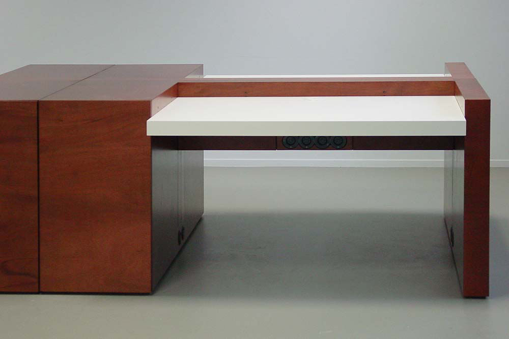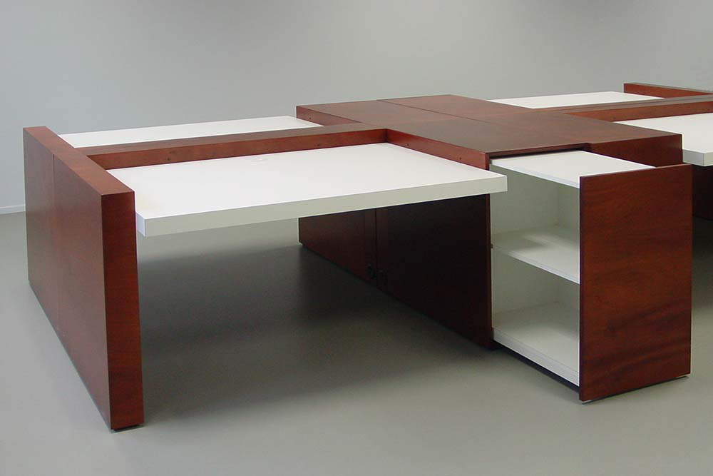Voor de kantoorruimte is een bureau ontworpen dat als stand-alone kan worden gebruikt of tot groepen geschakeld kan worden. Het werkblad is per bureau individueel op hoogte in te stellen. Door de houten omranding die een vaste hoogte heeft ontstaat er een rustig beeld, ook als de bureaubladen op verschillende hoogte ingesteld worden. De bureaus hebben een uitschuifbare kast die daardoor goed bereikbaar is. Uitgeschoven biedt deze kast ook nog extra aflegruimte bij het bureau.