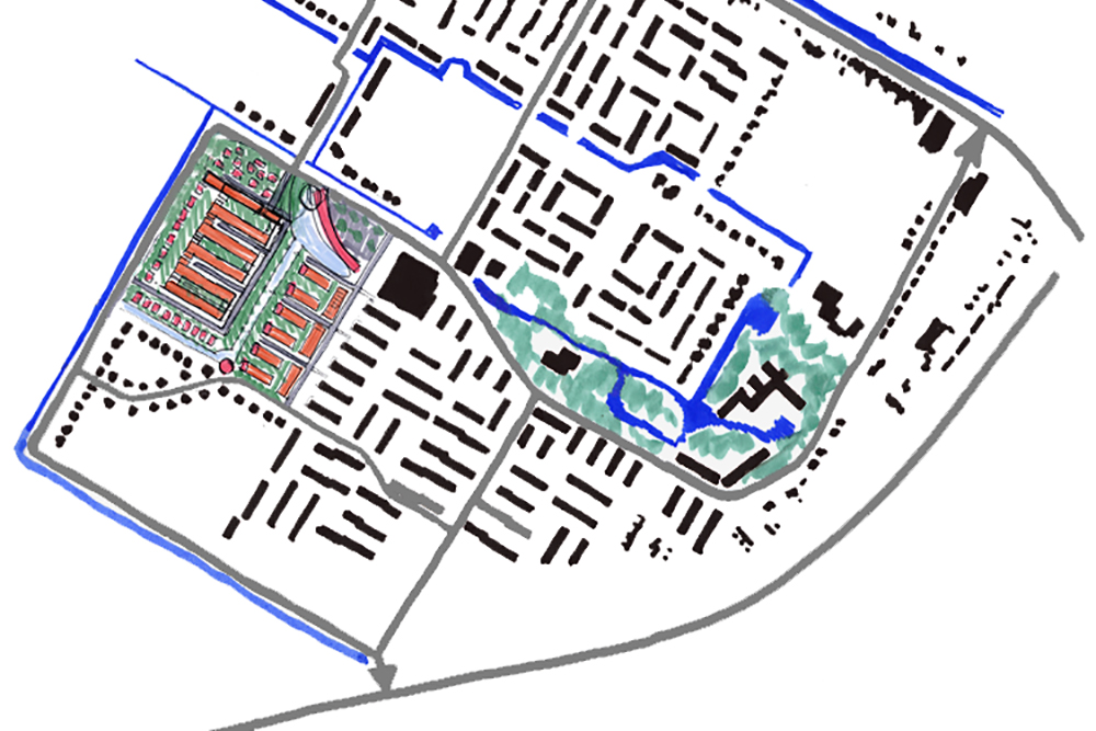 De nieuwe ontsluitingsweg door het plangebied wordt begeleidt door groen en water. Het openbare gebied in de uitbreiding is in deze zone geconcentreerd zodat een gebied ontstaat met optimale gebruiksmogelijkheden en een ruimtelijk karakter.
