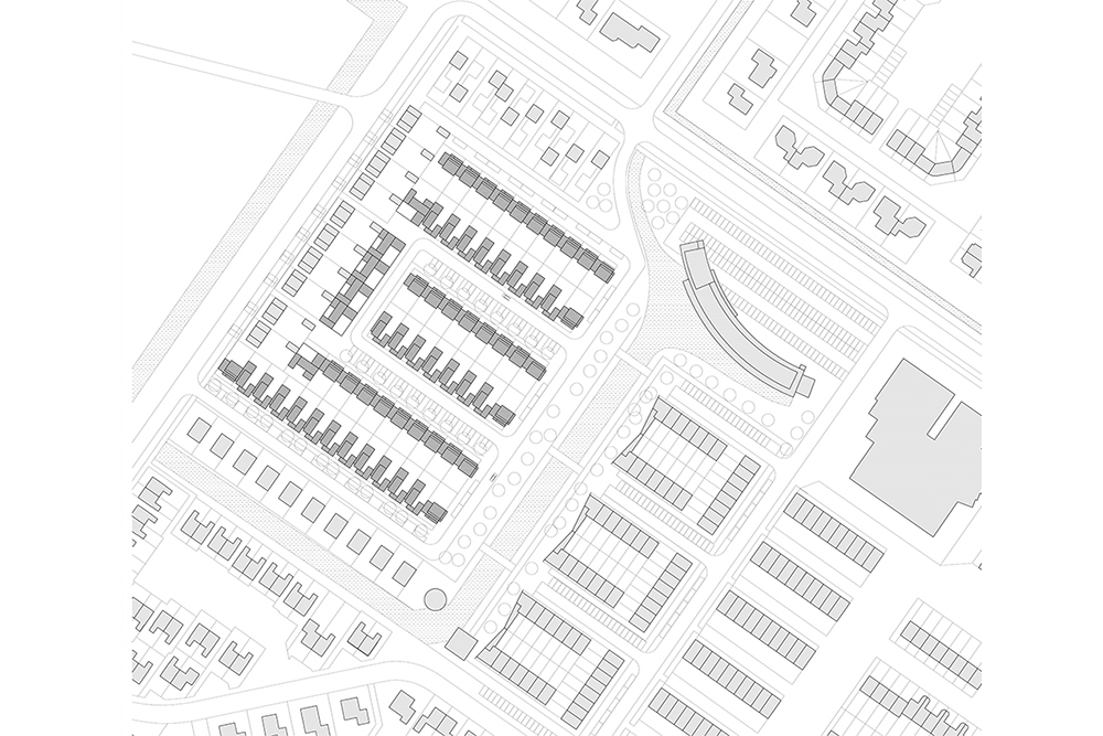 Aan de noordwest kant, tussen het centrale groene gebied en de open verkaveling in de periferie ligt een gebied met woningen die geen directe relatie met omliggende gebieden heeft. Dit gebied is vormgegeven als een aantal autonome straten. Aan de zuidwest kant van deze straten liggen doorgaande linten van brede, ondiepe woningen. Deze woningen en bijhorende tuinen zijn optimaal op de zon georiƫnteerd. Aan de noordoost kant van de straat worden smalle, diepe, vrijstaande woningen gerealiseerd. Deze lamellen zorgen ervoor dat de zon diep de noord tuinen in kan schijnen.