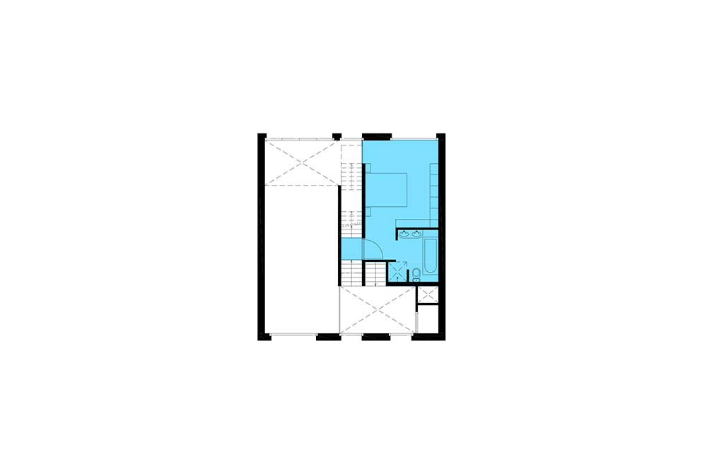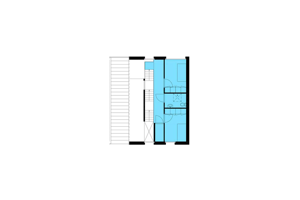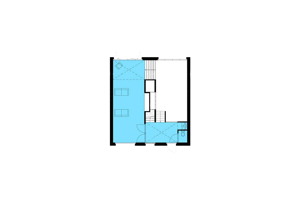 De tweedeling is in de woning ingezet om een interieur vol beleving te realiseren. De tussenstrook aan de buitenkant van de woning correspondeert aan de binnenzijde met een over de hele hoogte van het huis doorlopende ruimte waarin trappen de verspringende vloeren van de beide woonhuishelften ontsluiten. In de ene helft van het huis is aan de voorzijde ter plaatse van de entree een anderhalve verdieping hoge entreeruimte gerealiseerd. Dat is riant binnenkomen! In de andere helft is aan de achtergevel een vide over de hele hoogte van het huis gerealiseerd.
