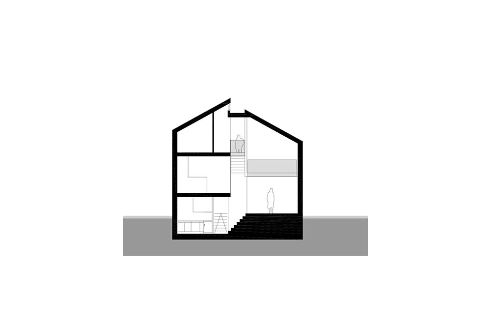 De straat wordt gekarakteriseerd door kleine, smalle, vrijstaande woonhuizen met een diversiteit aan dakvormen en tussenruimtes van ongeveer één meter. Om het huis qua maat, schaal en ritme te voegen in het historische straatbeeld is het opgedeeld in twee helften met in hoogte verspringende schuine daken en een transparante tussenzone van een meter.