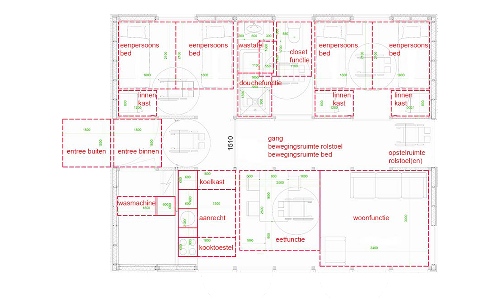 De brede gang zorgt ervoor dat er veel bewegingsruimte is voor mensen in een rolstoel of met een rollator en er ook voldoende opstelruimte is voor hulpmiddelen. De modulaire opzet, brede doorgangen en open verbinding van de woonkamer met de gang maakt het mogelijk om een bed vanuit een van de slaapkamers de woonkamer in te rijden.