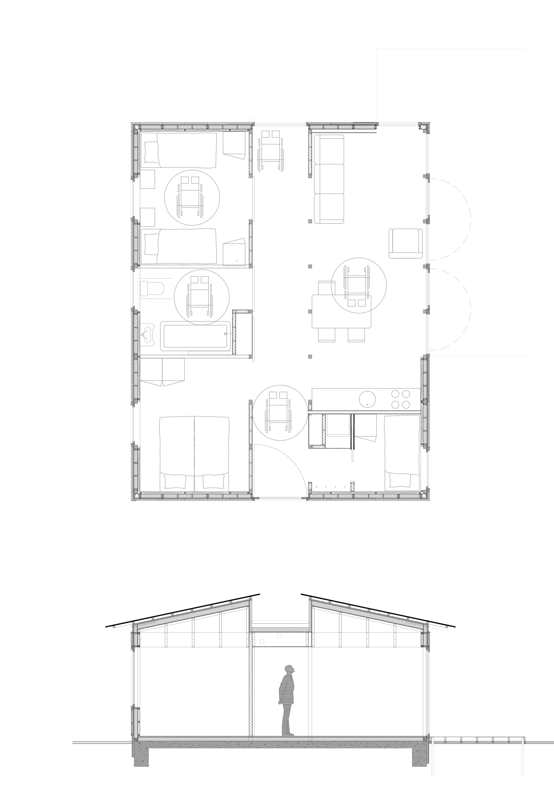 Brede middengangDe woning is georganiseerd rond een centrale 1,5 meter brede gang die over de hele diepte van de woning loopt. De ruime slaapkamers, en badkamer liggen aan de noordkant van deze gang, de woonkamer aan de zuidkant staat in open verbinding met deze gang en kan straks desgewenst (voor privacy, of het vasthouden van warmte) afgescheiden worden door een gordijn. Deze opbouw is ook buiten in de woning zichtbaar. De centrale middengang is plat afgedekt en heeft aan beiden uiteinden grote glazen gevels waarvan één gevormd wordt door een grote taatsdeur die de toegang tot de woning vormt. Aan weerszijden van de centrale gang heeft de woning een flauw hellend geisoleerd dak dat is afgedekt met een lichte stalen dakplaat met een flink overstek.