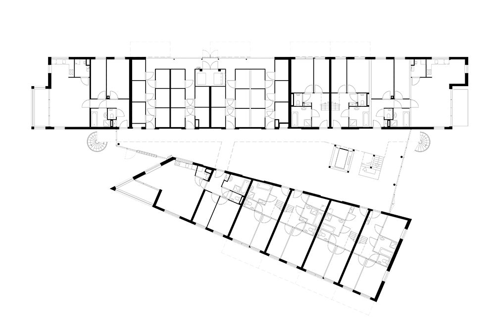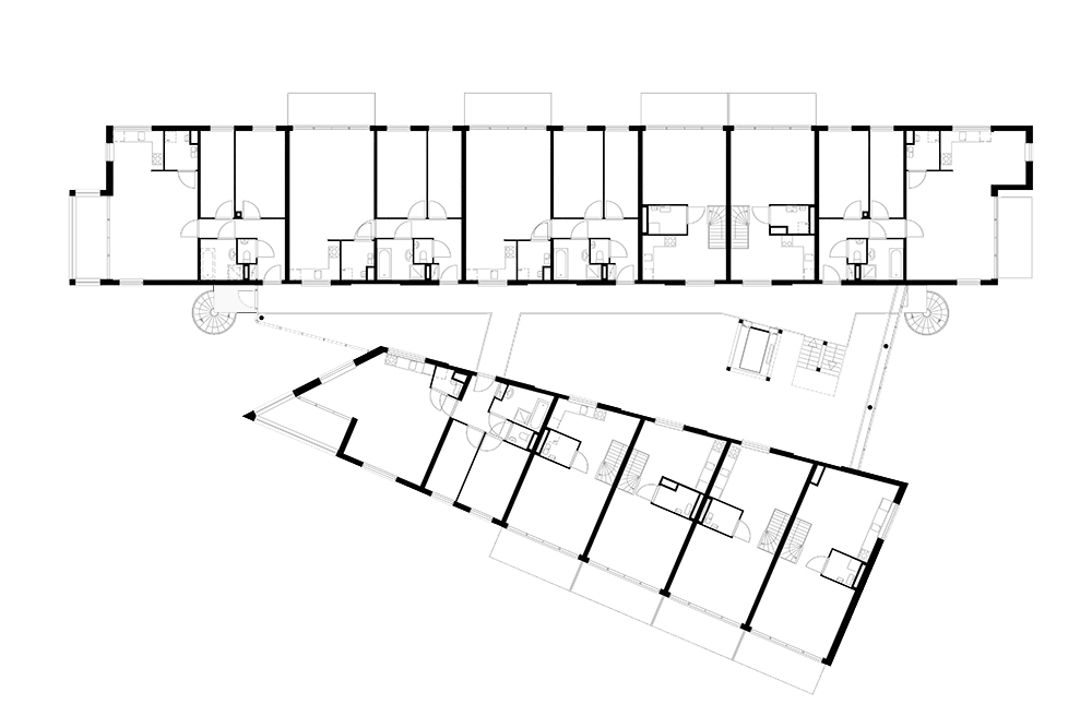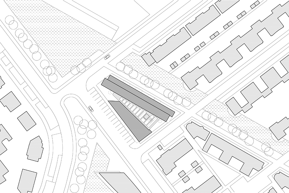 Albertshoeve in Castricum bestaat uit een stroken verkaveling waar diagonaal een groenzone doorheen loopt. Voor één van de driehoekige kavels die door deze structuur op de uiteinden ontstaan is een ontwerp gemaakt. Om de locatie optimaal te benutten zijn 22 appartementen in twee stroken in de periferie gesitueerd rond een gemeenschappelijk binnenruimte. Elk appartement is optimaal afgestemd op bezonning, uitzicht en beschikbare ruimte. De binnenwanden van het atrium zijn bekleed met geluidsabsorberende witte houten delen die het door het dak binnen vallende licht reflecteren en het atrium lichter maken.